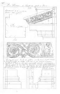 Je n’ay pas trouvé les bas du pilastre mais j’ai trouvé son plan marqué sur le lits de dessus de sa base comme aussi le plan de l’orle ou ceinture de toute cette ediffice – il ne rest qu’un morceau de la corniche 2 morceaux de l’architrave et frise un chapiteau d’un pilastre le hault quelque assises et la base du pilastre et une base de colonne ancor n’est elle pas tout entiere parce que j’en ay veu scier une partie. Cette base a les mesme mesures que celles du pilastre; la largeur du pilastre par le bas estoit de 6‘.1“.
